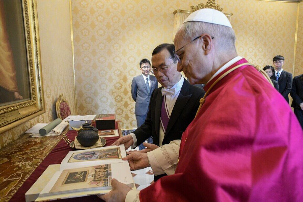 駐教廷大使賀忠義(左)3日向教宗良十四世(白帽者)致贈5件兼具台灣意涵與天主教意義的禮品。(駐教廷大使館提供)中央社記者黃雅詩羅馬傳真 114年7月4日